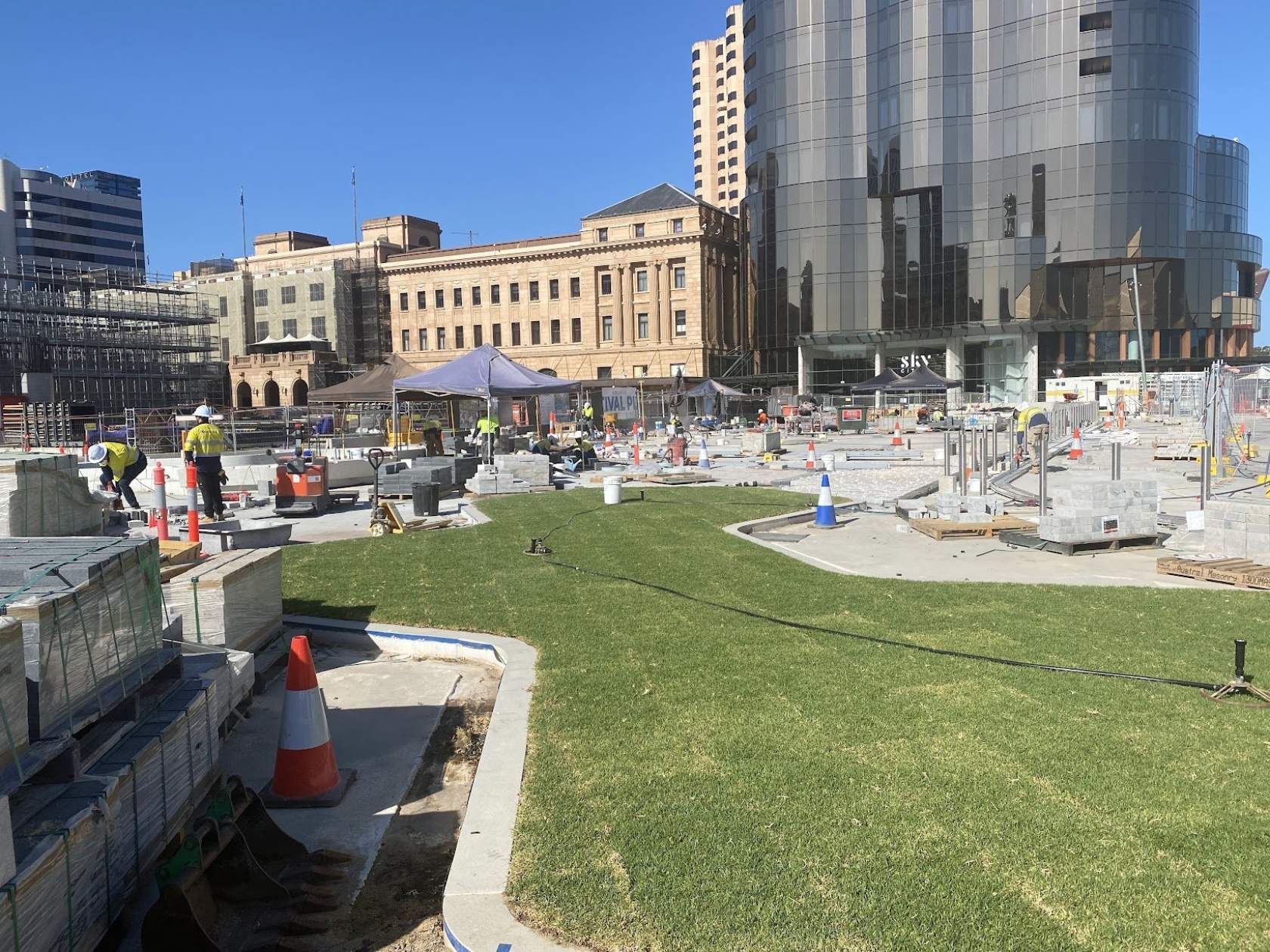 Festival Plaza's public realm has been significantly re-designed to accommodate 8,600m2 of event ready space. Â The space includes stunning new 11m wide tree-like arbours which will be host to bougainvillea and ornamental grape vines, as well as a 20m long interactive water feature, stunning paving and expansive lawns.